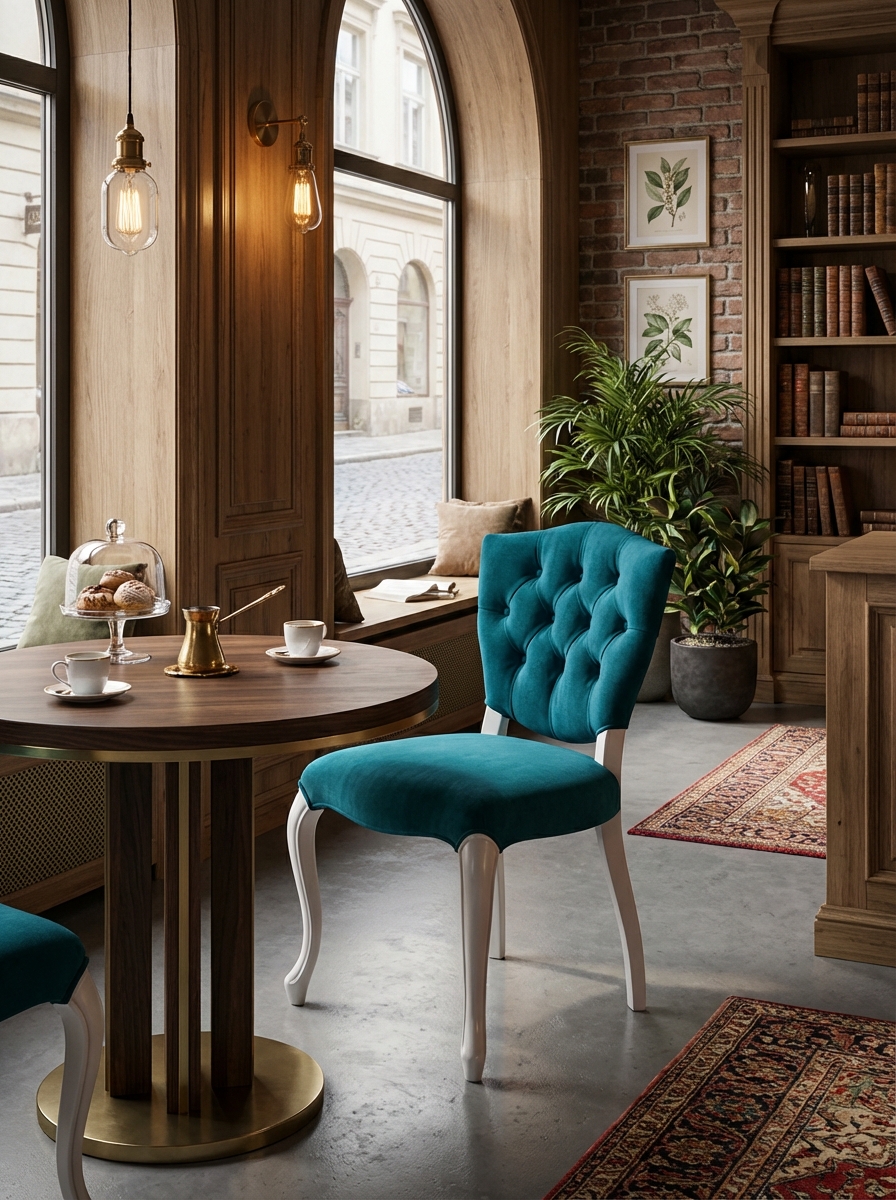 Markanızın prestijini doğrudan yansıtan, yüksek ticari standartlara uygun Regal Chesterfield Sandalye. Klasik Barok/Rokoko çizgileri, işletmenizin 'premium' algısını anında yükseltir. Yoğun kullanıma karşı güçlendirilmiş S şeklinde kıvrımlı (cabriole) oymalı beyaz ayaklar ve kolay temizlenebilir, yoğun HORECA trafiğine dayanıklı teal (turkuaz) kadife döşeme ile uzun ömürlülük garantilenmiştir. Derin düğme kapitone detayları, misafirlerinize eşsiz bir konfor ve zengin bir doku sunarken, minimum bakım maliyetiyle maksimum yatırım getirisi (ROI) elde etmenizi sağlar. Bu sandalye, yüksek müşteri memnuniyeti odaklı ticari projeler için idealdir.