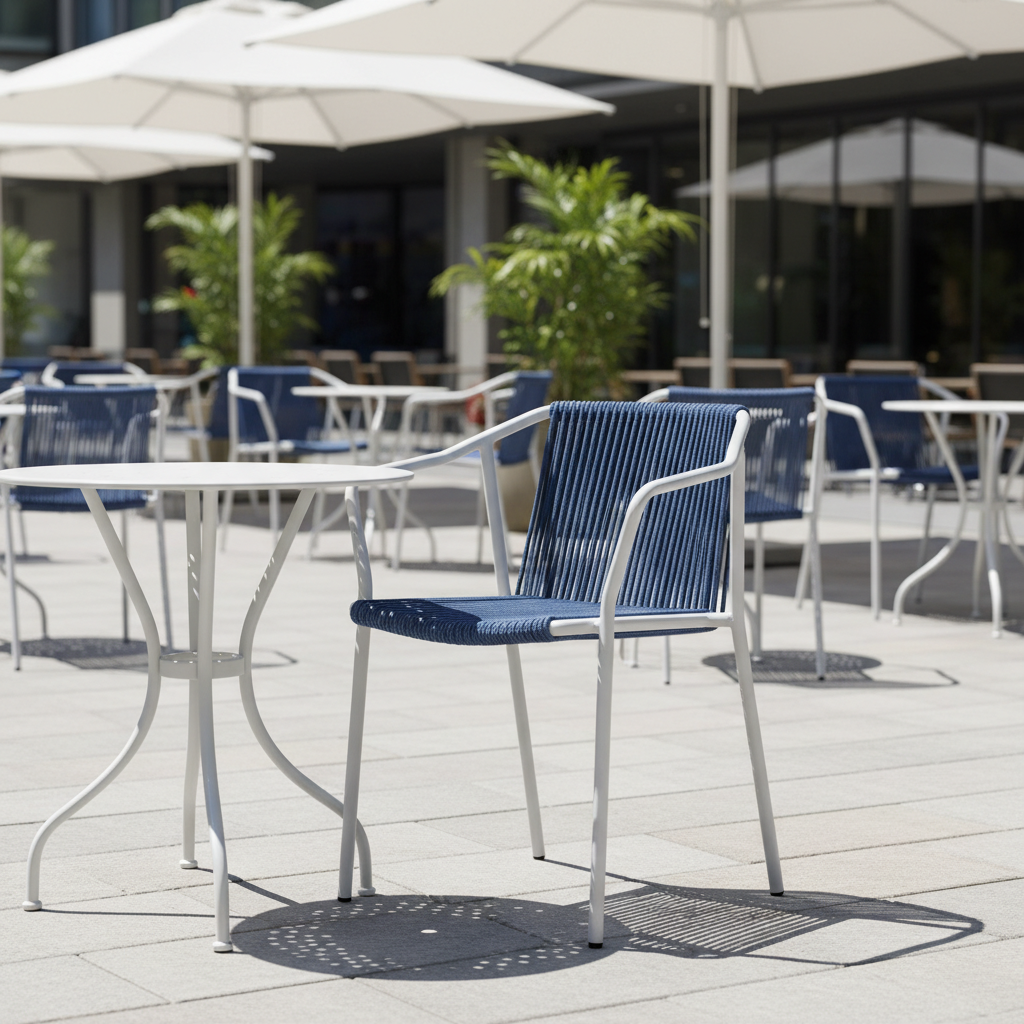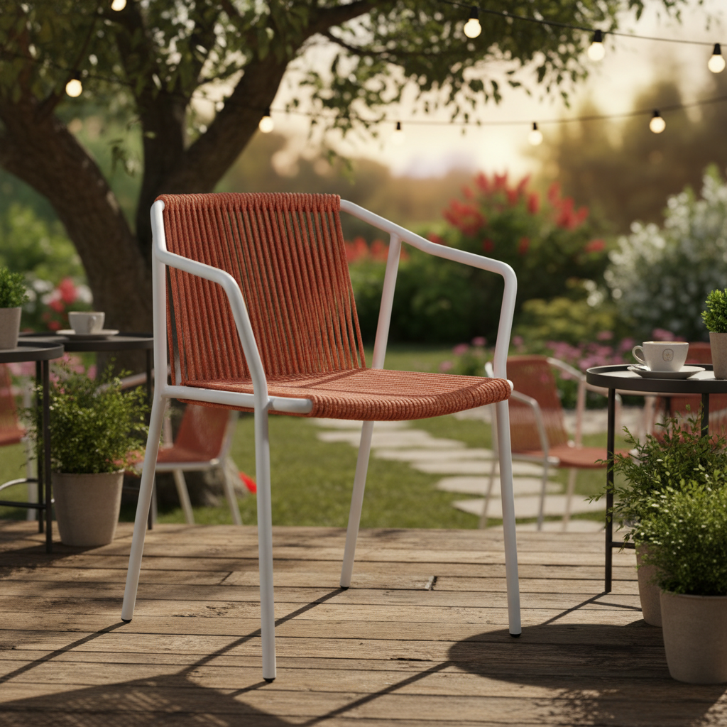 Sandalyeler kategorisinin en yeni trendi: Lacivert suya ve UV ışınlarına dayanıklı özel sentetik ip örgü ile tasarlanmış, ergonomik kollu dış mekan sandalyesi. Beyaz toz boya ile kaplanmış sağlam metal iskeleti sayesinde en zorlu dış mekan koşullarına karşı üstün dayanıklılık sunar. Nefes alan ipli dokusu, sıcak yaz günlerinde dahi konforlu bir oturma deneyimi sağlarken, hafif ve istiflenebilir yapısı hem ev (balkon, teras, bahçe) hem de ticari (kafe, restoran) kullanımlar için pratiklik sağlar. Oturma alanınıza anında modern ve sofistike bir dokunuş katın.