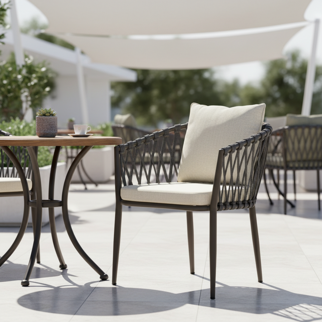 Akdeniz'in huzurunu ve şıklığını dış mekanlarınıza taşıyan Thalia Kollu İp Örgülü Sandalye ile tanışın. Modern tasarımı, sağlam metal iskeleti ve hava koşullarına dayanıklı özel ip örgüsü sayesinde hem estetik hem de fonksiyonellik sunar. Konforlu minderleriyle yaz akşamlarınızı veya gündüz kahvelerinizi eşsiz bir keyfe dönüştürerek, misafirlerinizi ağırlamak için ideal bir atmosfer yaratın.