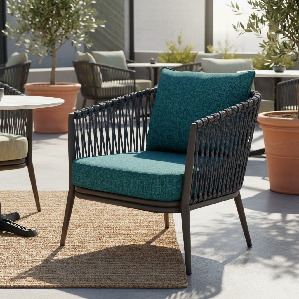 Zema Kollu Örme Koltuk ile dış mekanlarınıza modern bir dokunuş katın. Konforlu kumaş minderleri ve dayanıklı halat örgü detaylarıyla bu şık koltuk, huzurlu anların yeni adresi olacak. Zarafeti ve sağlamlığı bir araya getiren tasarımıyla mekanlarınızda unutulmaz bir atmosfer yaratın.