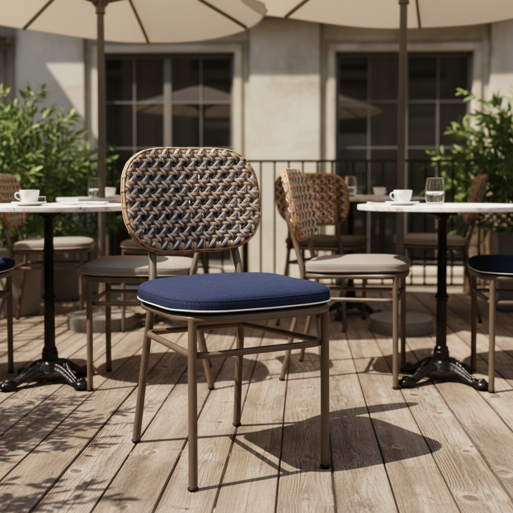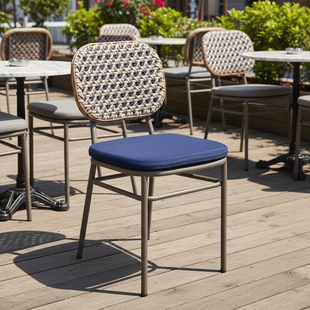 Estetik ve dayanıklılığı bir araya getiren bu çok amaçlı sandalye, hem evinizin hem de ticari mekanlarınızın (kafe, restoran) gözdesi olacak. Güçlü ve uzun ömürlü metal iskeleti üzerine inşa edilmiştir ve iç/dış mekan kullanımına tamamen uygundur. Sırt kısmındaki sentetik rattan örgüler; kahverengi, gri ve beyaz tonlardaki benzersiz deseniyle rustik ve modern tarzları harmanlar. Oturma yüzeyindeki kalın, çıkarılabilir bej/gri minder sayesinde uzun süreli oturumlarda bile maksimum konfor sağlar. Mutfak masaları ve balkon takımları için ideal, kolay temizlenebilir bir oturma çözümüdür.