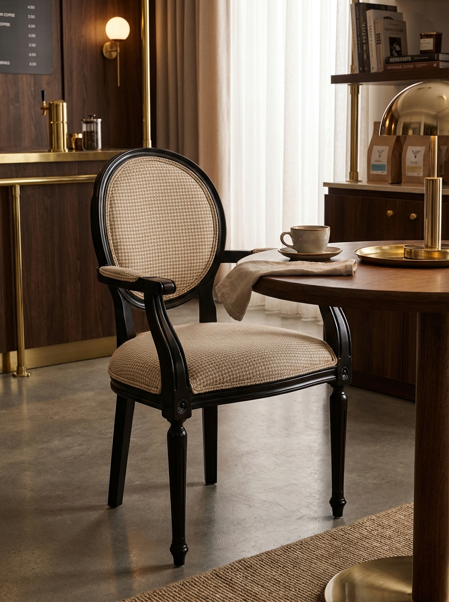 Zarif hatları ve konforlu kumaş döşemesiyle mekanlarınıza asil bir dokunuş katın. Dayanıklı ahşap iskeleti ve ergonomik kolçaklarıyla uzun süreli keyifli anlar sunar. Hem şık yemek alanlarınızda hem de çalışma masalarınızda estetik ve rahatlığı bir araya getiren bu özel tasarım, zamansız bir atmosfer yaratır.