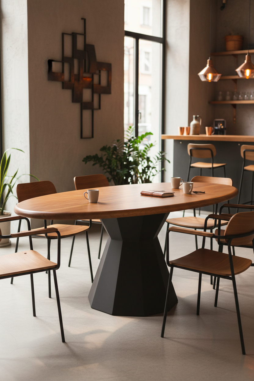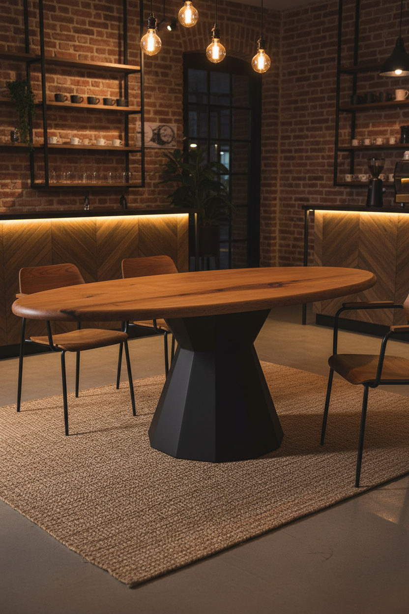 Doğal ahşabın sıcaklığını ve eşsiz dokusunu, modern metalin güçlü ve geometrik formuyla buluşturan Terra Oval Masamız, yemek odanıza sofistike bir dokunuş katıyor. Geniş oval yüzeyi, keyifli sohbetlere ve unutulmaz anlara ev sahipliği yaparken, sağlam metal ayağıyla uzun yıllar kalitesini korur. Bu benzersiz parça, mekanınıza çağdaş bir zarafet ve sıcaklık getirir.