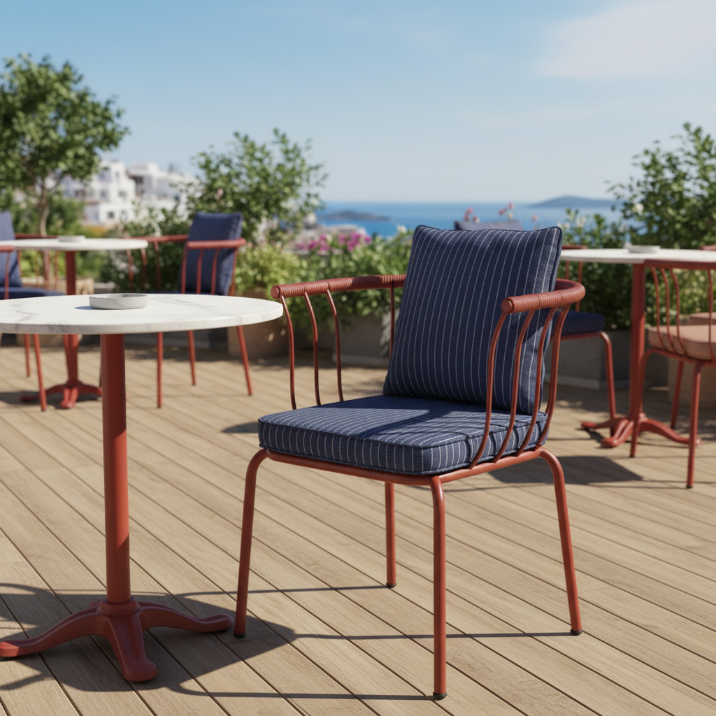 Konfor ve estetiği birleştiren bu özel tasarım metal sandalye, oturma deneyiminizi yeniden tanımlıyor. Dayanıklı kiremit (terracotta) rengi metal iskeleti, dış mekan koşullarına karşı üstün koruma sunarken, kalın ve yumuşak bej/taupe minderleri bulut konforu sağlar. Ergonomik sırt ve kol tasarımı sayesinde uzun süreli oturumlarda dahi ideal rahatlığı sunar. Balkonlar, teraslar, kış bahçeleri veya modern oturma odaları için idealdir. Evinizin her köşesine modern bir dokunuş ve dinlenme köşesi katmak isteyenler için mükemmel bir seçimdir.