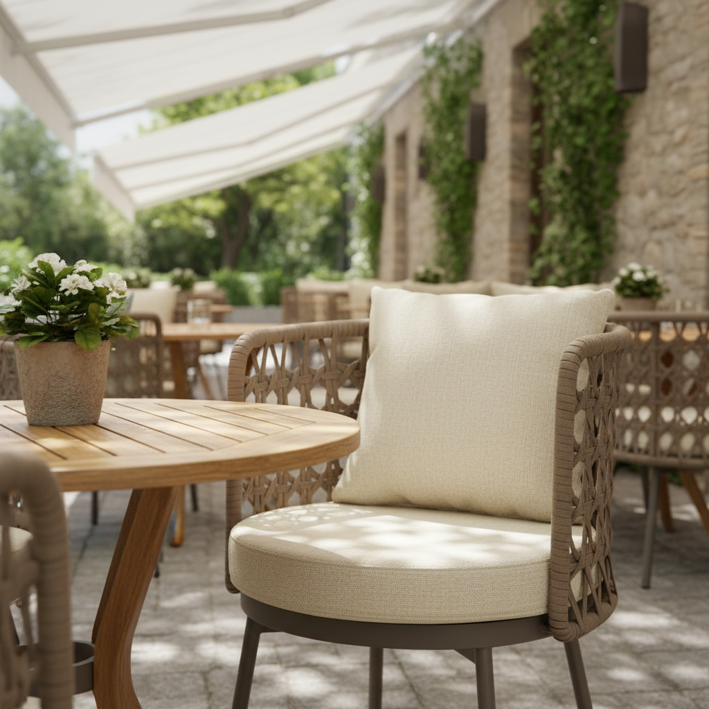 Vita Kollu Örme Sandalye ile dış mekanlarınıza zarafet ve konfor katın. Modern ve bohem detayları harmanlayan bu sandalye, dayanıklı örme yapısı ve lüks minderleriyle unutulmaz anlar vadediyor. Cafe, restoran veya evinizin bahçesi için ideal olan Vita, her anı bir kaçışa dönüştürecek.
