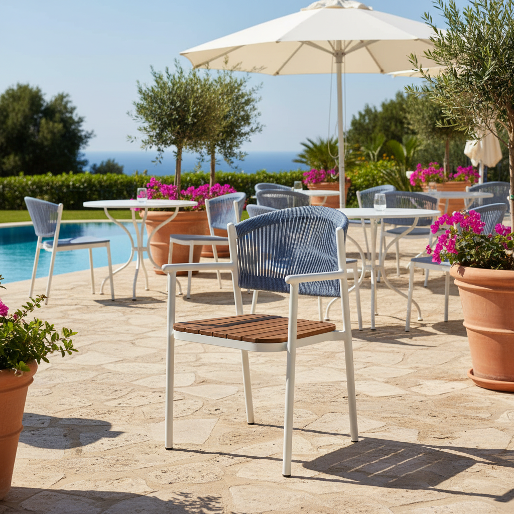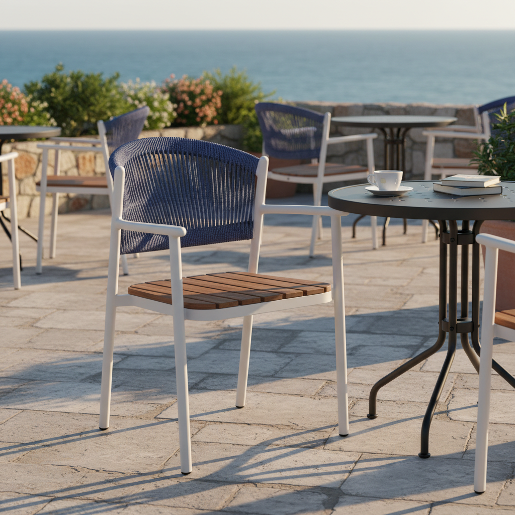 Deniz esintilerini ve huzuru mekanınıza taşıyın. Zafir Kollu Örme Sandalye, modern tasarımı, dayanıklı metal iskeleti, doğal ahşap oturma alanı ve şık örme sırt detayı ile dış mekanlarınıza estetik bir dokunuş katıyor. Ergonomik kolları ve yüksek kaliteli malzemeleriyle hem konforlu hem de göz alıcı bir oturma deneyimi sunar.
