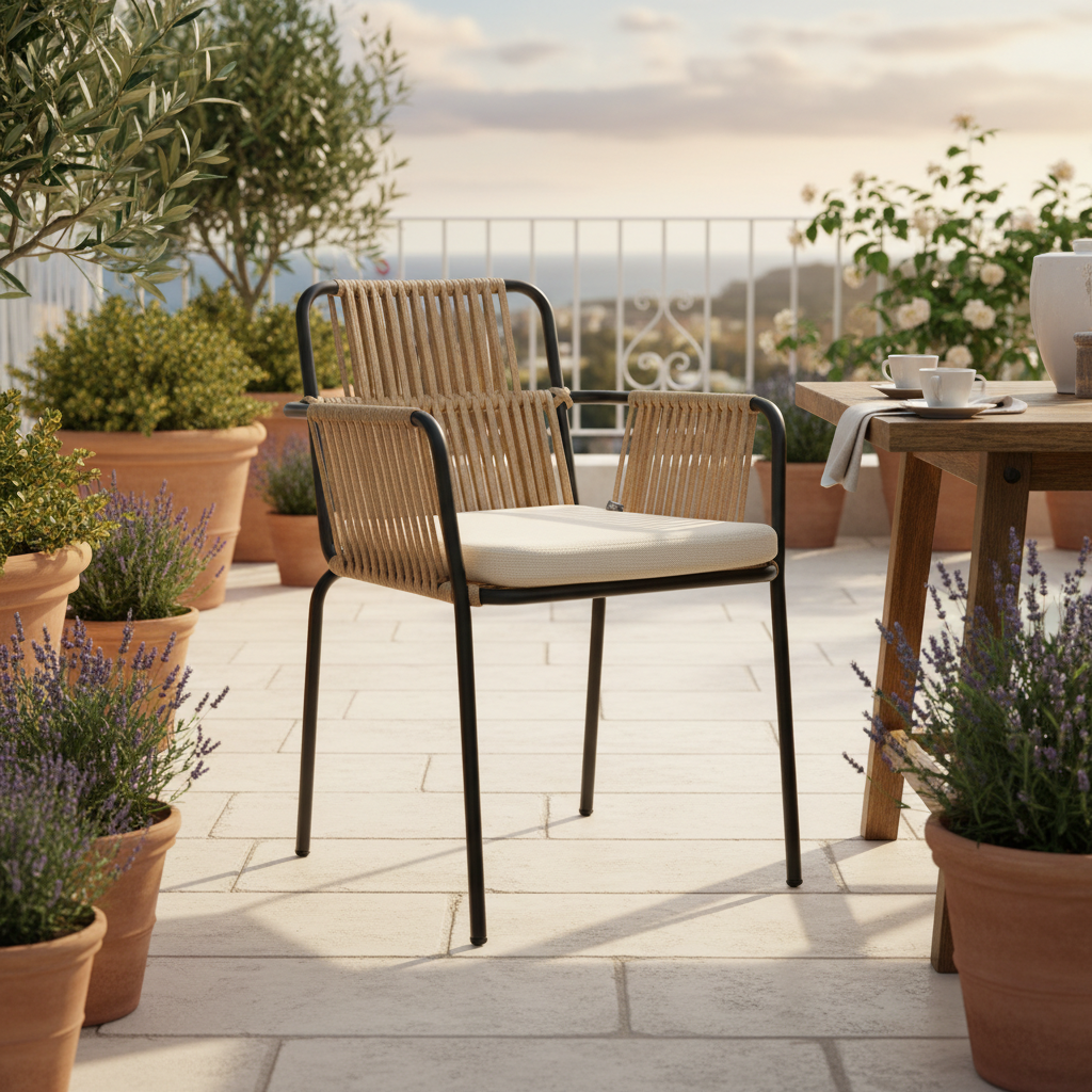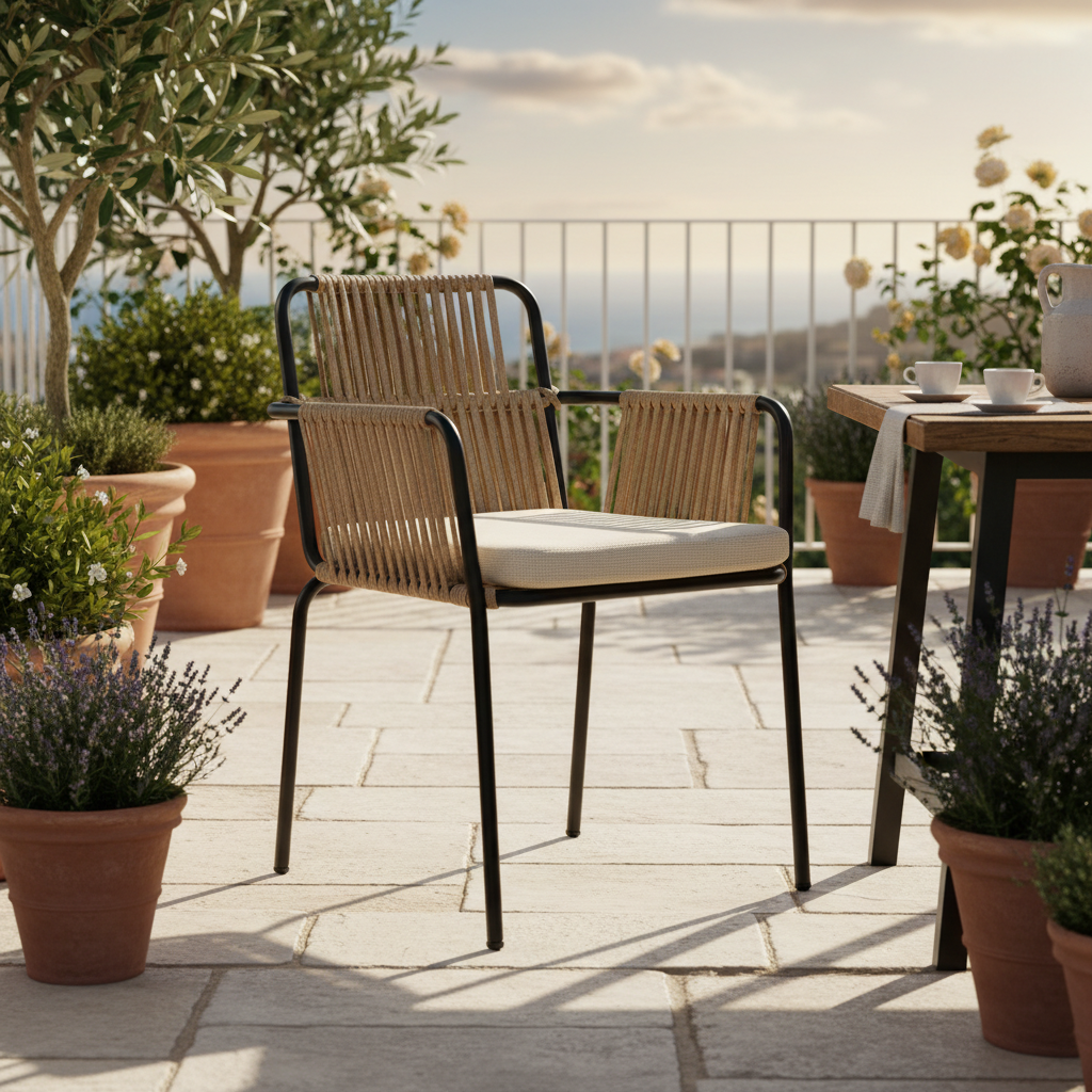 Dış mekanlarınızı Akdeniz esintisiyle taçlandırın! Terra Kollu Halat Örgü Sandalye, modern metal iskeleti ve doğal halat örgüsüyle hem göz alıcı bir estetik sunar hem de dayanıklılığı garanti eder. Konforlu minderiyle uzun yaz akşamları ve keyifli sohbetler için ideal bir oturma deneyimi vadediyor.