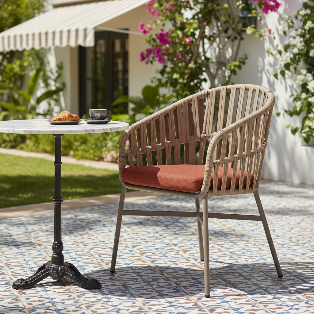 Bu modern örme kollu sandalye ile dış mekanlarınıza zarafet ve konfor katın. Dayanıklı metal iskeleti ve şık örme detayları, uzun süreli kullanım için ideal bir denge sunar. Balkonunuzda, terasınızda veya bahçenizde keyifli anlar yaratmak için tasarlanmıştır, turuncu kumaş minderi ise sıcak bir dokunuş ekler.