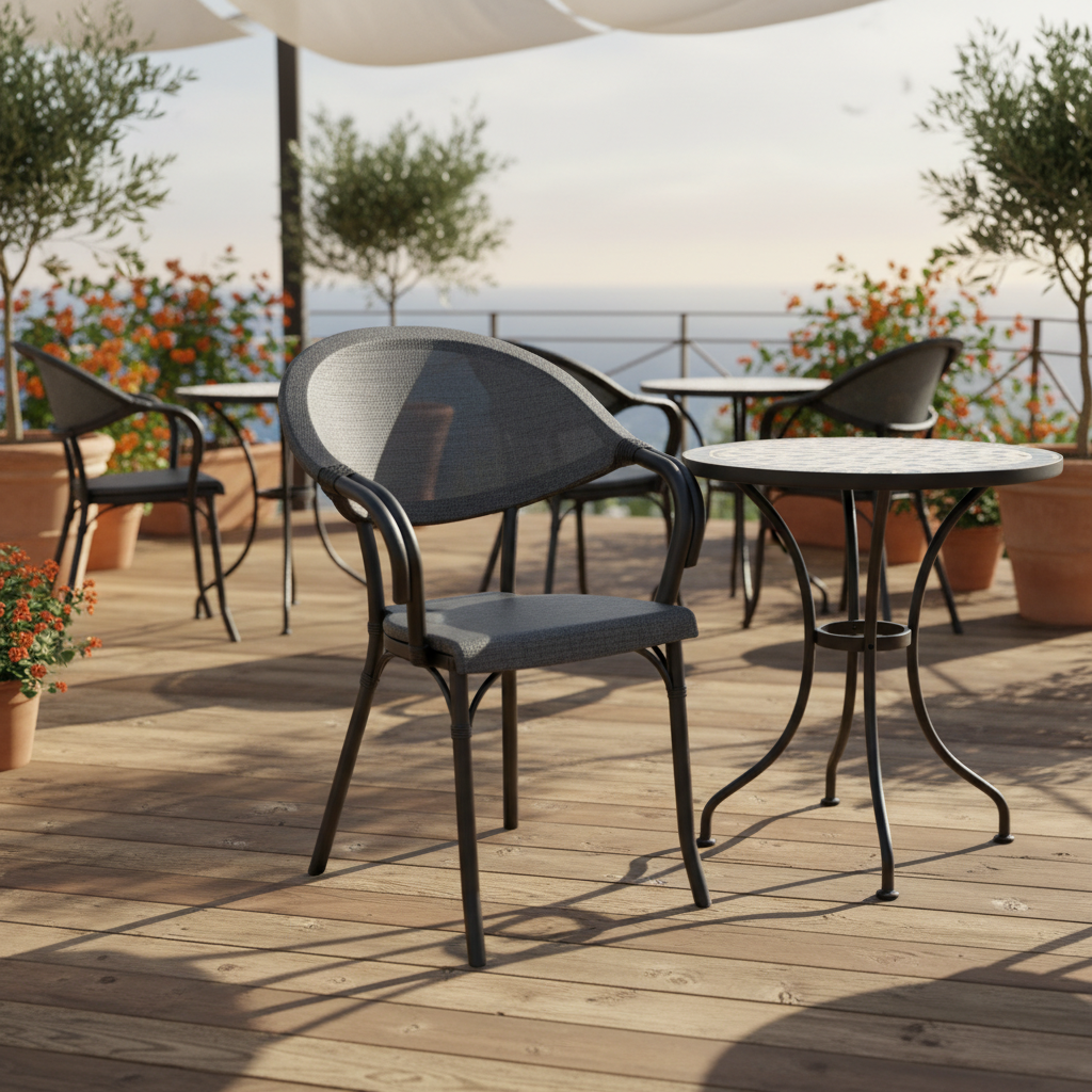 Akdeniz esintisi taşıyan Viera Kollu Örme Sandalye ile açık alanlarınıza zarafet katın. Ergonomik kolları ve dayanıklı örme yapısıyla hem konforlu hem de uzun ömürlü bir kullanım sunar. İstiflenebilir özelliği sayesinde pratik depolama imkanı sağlarken, şık tasarımıyla her türlü dış mekan dekorasyonuna uyum sağlar.