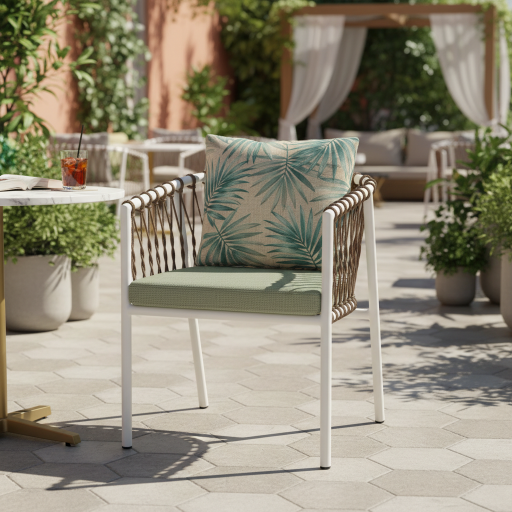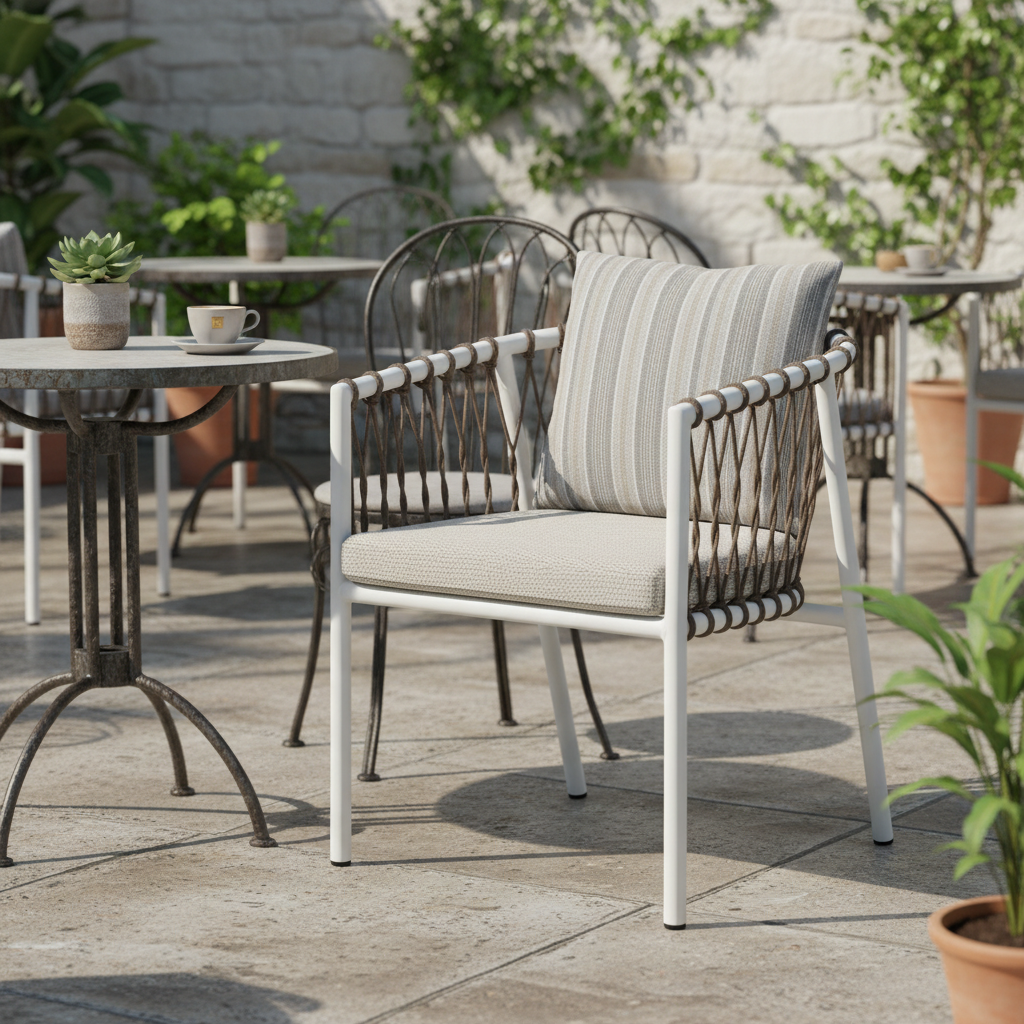 Modern dış mekan yaşam alanlarınız için tasarlanan bu şık sandalye, estetik ve dayanıklılığı birleştiriyor. Paslanmaya karşı dirençli beyaz elektrostatik boyalı sağlam metal iskeleti ve hava koşullarına dayanıklı kahverengi sentetik ip dokuma detayları ile yıllarca güvenle kullanabilirsiniz. Suya ve güneşe karşı korumalı, kalın ve yumuşak oturma minderi (ayrıca çizgili sırt yastığı) sayesinde Sandalye konforunu dış mekanda lüks bir seviyeye taşıyor. Balkon, teras ya da bahçenizdeki oturma düzenini tamamlayacak, rahatlık arayanlar için ideal bir seçimdir. Kafe ve restoran gibi işletmeler için de dayanıklı ve stil sahibi bir alternatiftir.