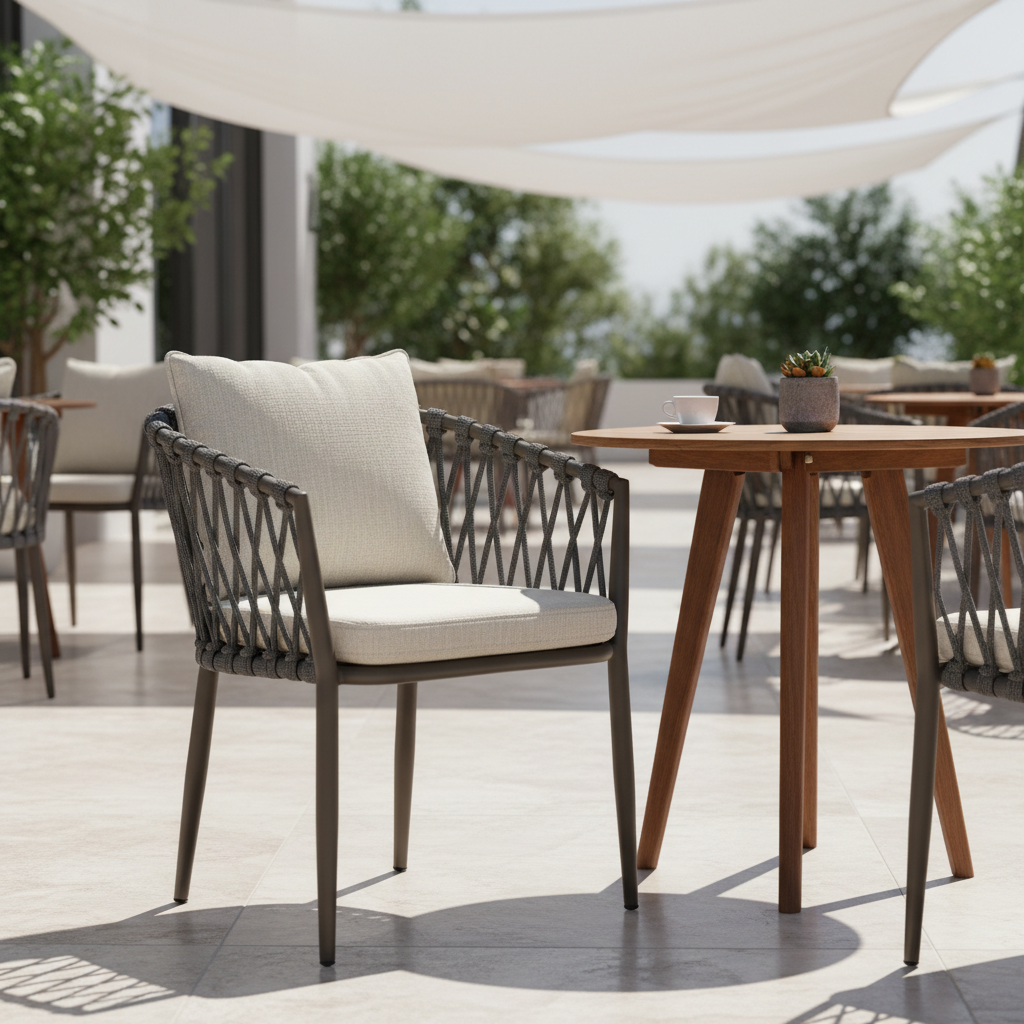 Akdeniz'in huzurunu ve şıklığını dış mekanlarınıza taşıyan Thalia Kollu İp Örgülü Sandalye ile tanışın. Modern tasarımı, sağlam metal iskeleti ve hava koşullarına dayanıklı özel ip örgüsü sayesinde hem estetik hem de fonksiyonellik sunar. Konforlu minderleriyle yaz akşamlarınızı veya gündüz kahvelerinizi eşsiz bir keyfe dönüştürerek, misafirlerinizi ağırlamak için ideal bir atmosfer yaratın.