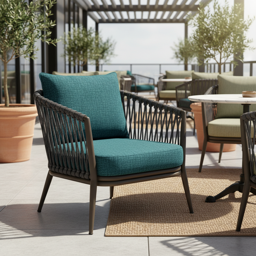 Zema Kollu Örme Koltuk ile dış mekanlarınıza modern bir dokunuş katın. Konforlu kumaş minderleri ve dayanıklı halat örgü detaylarıyla bu şık koltuk, huzurlu anların yeni adresi olacak. Zarafeti ve sağlamlığı bir araya getiren tasarımıyla mekanlarınızda unutulmaz bir atmosfer yaratın.