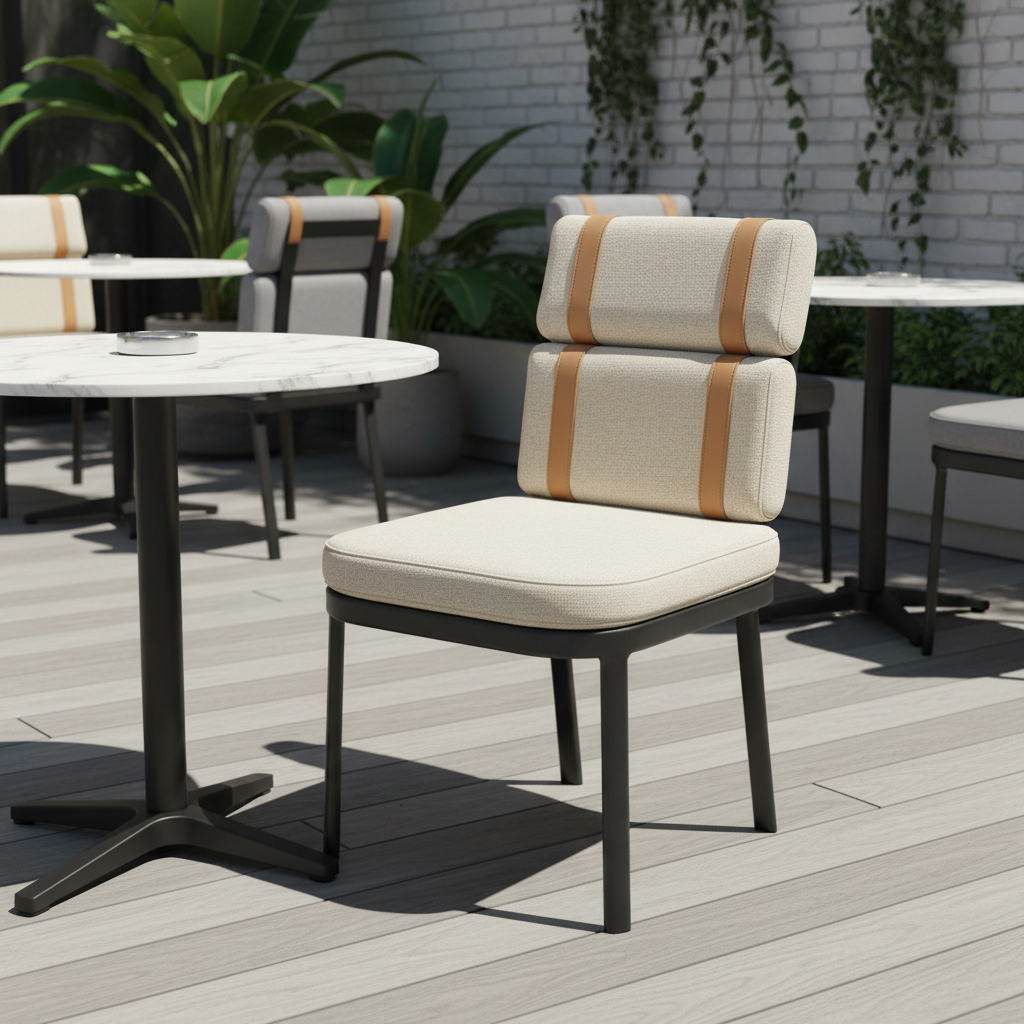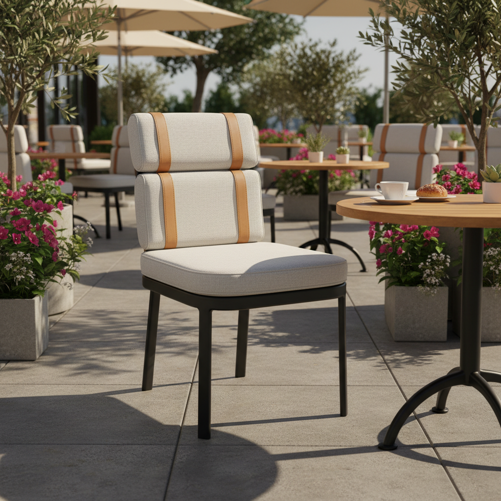 Yemek odanıza veya mutfağınıza çağdaş bir dokunuş katın. Bu eşsiz sandalye, dayanıklı mat siyah metal iskeleti üzerine oturan konforlu, kalın gri kumaş minderlere sahiptir. En dikkat çekici özelliği, sandalyeye lüks bir hava katan ve ergonomik sırt yastıklarını saran dikey taba rengi deri (veya suni deri) kayış detaylarıdır. İki parçalı sırt tasarımı sayesinde uzun süreli oturmalarda dahi maksimum destek ve rahatlık sunar. Modern, İskandinav veya Endüstriyel dekorasyon stillerine kolayca uyum sağlar. Misafirlerinizi rahatça ağırlayabileceğiniz, yüksek standartlı ve uzun ömürlü bir oturma çözümüdür.
