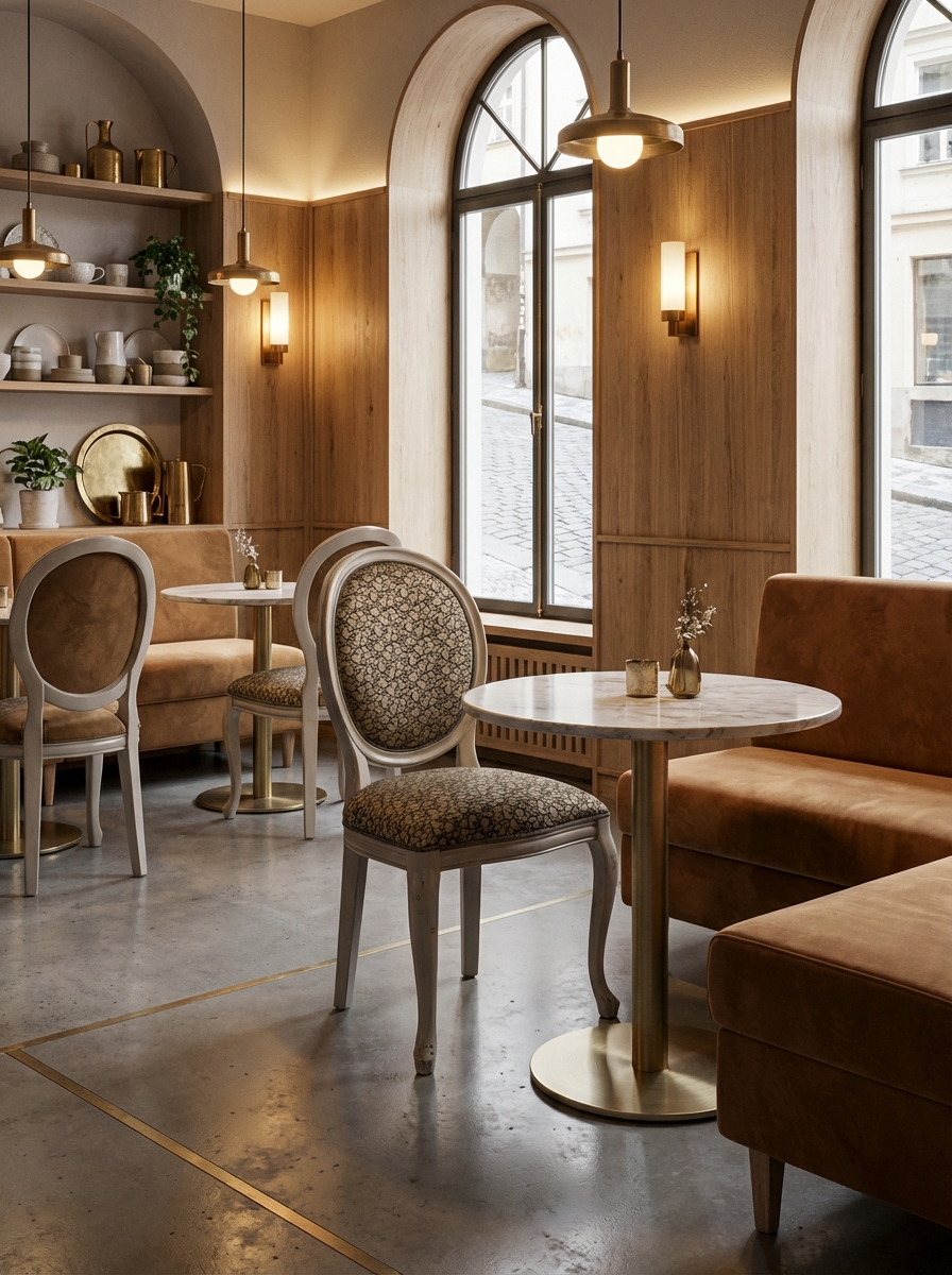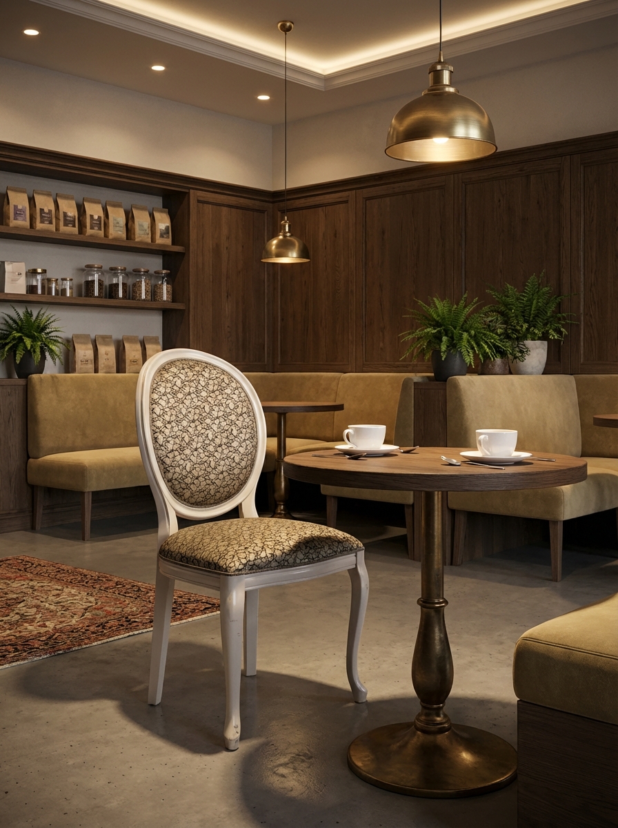 İşletmenizin marka değerini ve misafir memnuniyetini en üst düzeye çıkarmak için tasarlanan Versailles Medallion Sandalye, klasik zarafet ile ticari performansı birleştirir. Otel, kafe ve restoran projeleri için özel olarak güçlendirilmiş, estetik yıpranmayı (distressed) minimize eden ahşap iskelete ve S-şekilli (cabriole) ayaklara sahiptir. Yoğun kullanıma uygun, leke tutmaz (kolay temizlenebilir) kumaş kaplaması (siyah/kahverengi dantel desenli bej zemin) sayesinde yüksek hijyen standartlarınızı korur. Bu zamansız Louis stili, işletmenize premium bir algı kazandırırken, üstün malzeme kalitesi sayesinde uzun ömürlülük ve düşük bakım maliyetleri sunarak yatırımınızın geri dönüşünü (ROI) garanti eder. Mimari projelerinizde fark yaratan, güvenilir bir B2B çözümüdür.