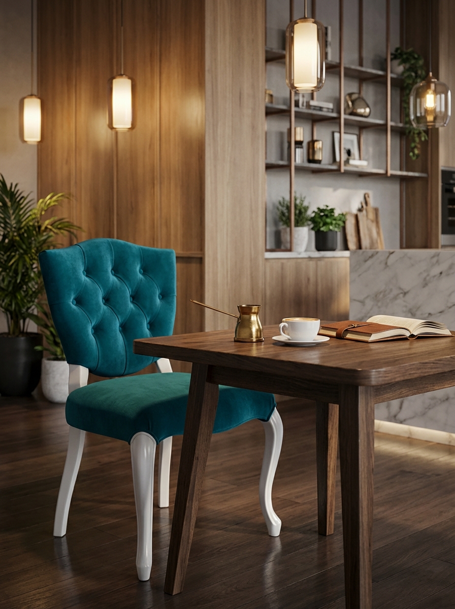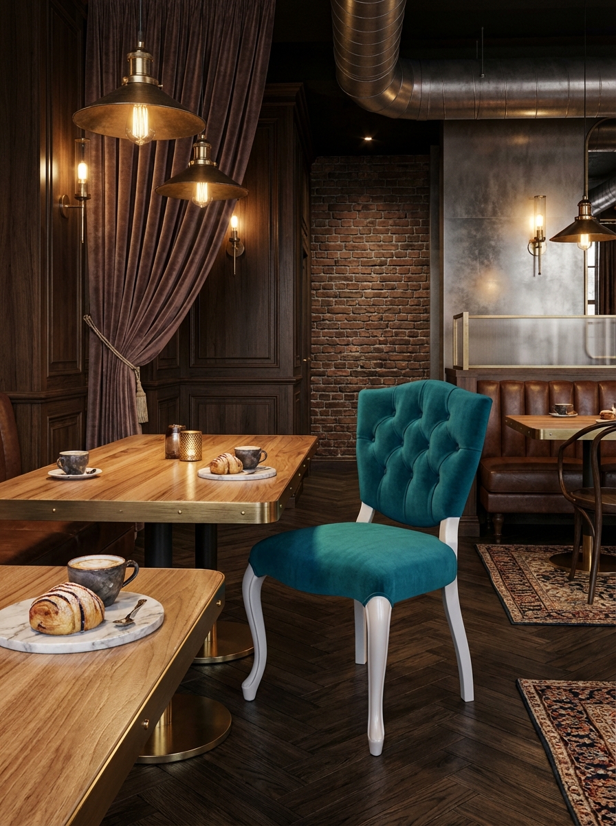 Markanızın prestijini doğrudan yansıtan, yüksek ticari standartlara uygun Regal Chesterfield Sandalye. Klasik Barok/Rokoko çizgileri, işletmenizin 'premium' algısını anında yükseltir. Yoğun kullanıma karşı güçlendirilmiş S şeklinde kıvrımlı (cabriole) oymalı beyaz ayaklar ve kolay temizlenebilir, yoğun HORECA trafiğine dayanıklı teal (turkuaz) kadife döşeme ile uzun ömürlülük garantilenmiştir. Derin düğme kapitone detayları, misafirlerinize eşsiz bir konfor ve zengin bir doku sunarken, minimum bakım maliyetiyle maksimum yatırım getirisi (ROI) elde etmenizi sağlar. Bu sandalye, yüksek müşteri memnuniyeti odaklı ticari projeler için idealdir.