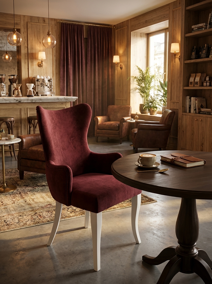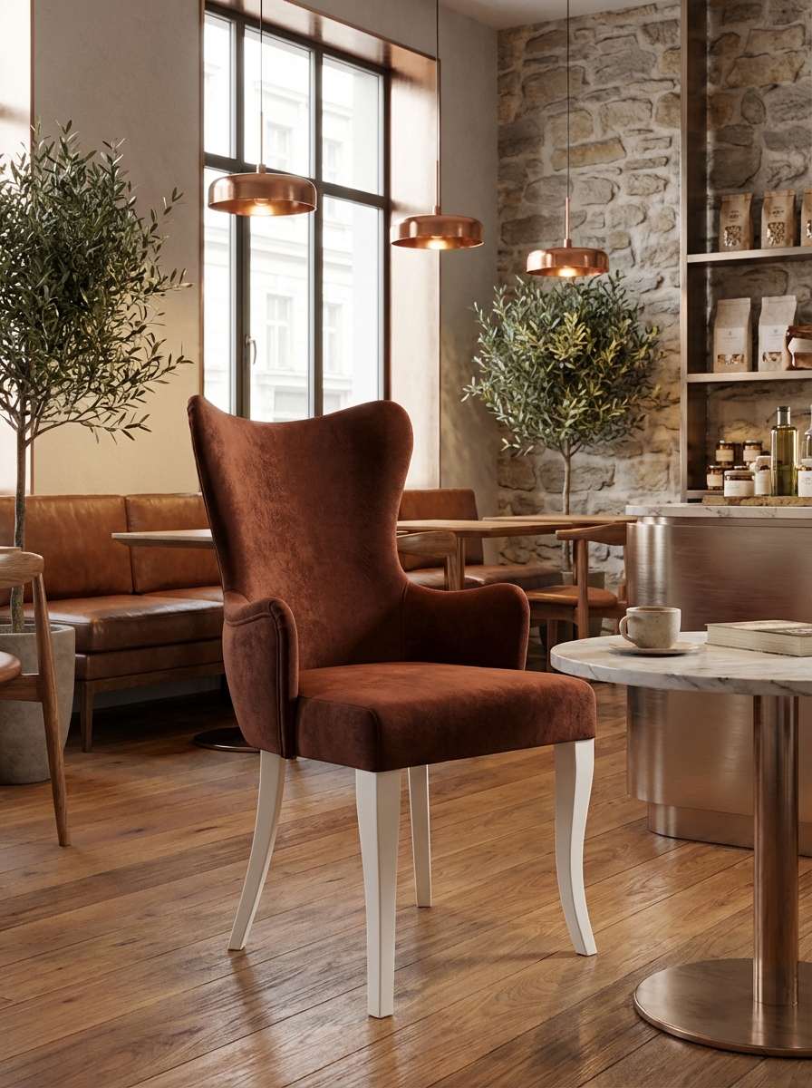 Zarafet ve konforu birleştiren, yüksek sırtlı ve kolçaklı lüks kumaş sandalye. Derin bordo/kızıl kahve tonlarındaki yumuşak dokulu kumaşı, klasik tarzda tasarlanmış krem veya beyaz renkteki ahşap ayaklarla tamamlanmıştır. Yemek odaları, salonlar veya şık kafe/restoran ortamları için sofistike bir seçimdir. Kanatlı sırt yapısı (wingback) sayesinde üstün oturma konforu sunar.