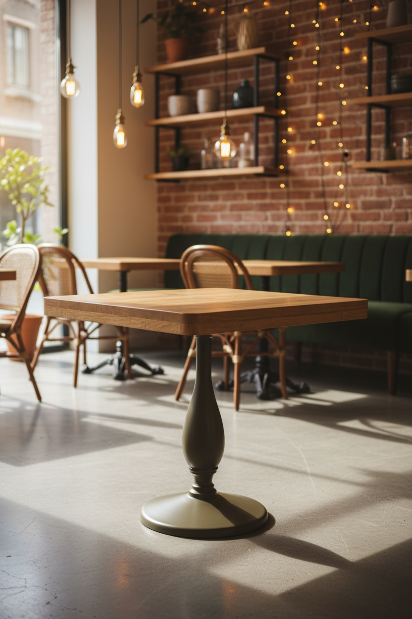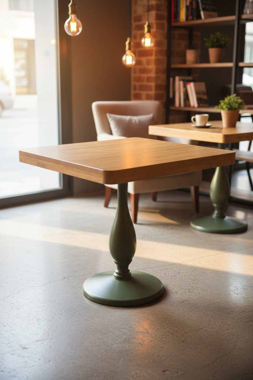 Profesyonel işletmeler, mimarlar ve satınalma müdürleri için tasarlanmış, performansı ve estetiği birleştiren bu model, mekanınızın premium algısını güçlendirir. Müşteri deneyiminde kritik rol oynayan stabilite ve konforu, zarif ve bombeli tek döküm ayak tasarımıyla garanti altına alır. Bu sayede, zeminde dengeyi korur ve masa sallanması kaynaklı müşteri şikayetlerini sıfırlar. Doğal ahşap görünümlü dayanıklı tabla yüzeyi, en yoğun kafe ve restoran trafiğine karşı dirençlidir. Kolay temizlenebilirlik özelliği sayesinde hijyen standartlarınızı hızla karşılarken, operasyonel temizlik maliyetlerinizi düşürür. Uzun ömürlü yapısı, sık mobilya yenileme ihtiyacını ortadan kaldırarak işletmeniz için maksimum yatırım getirisi (ROI) sağlar. Klasik ve zamansız tasarımı, yenileme projelerinizde esneklik sunar.